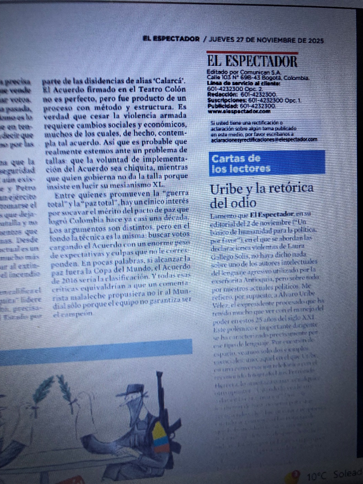¡Amables lectores multicreyentes y sentipensantes!, esta propuesta fue elegida como carta de la semana por el periódico colombiano El Espectador de Bogotá y fue publicada hoy jueves 27 de noviembre. Se puede encontrar en la edición impresa (p. 18) y en la página web de esa fecha en el link siguiente: https://www.elespectador.com/opinion/lectores/cartas/cartas-de-los-lectores-uribe-y-la-retorica-del-, que ahora comparto en mi blog.